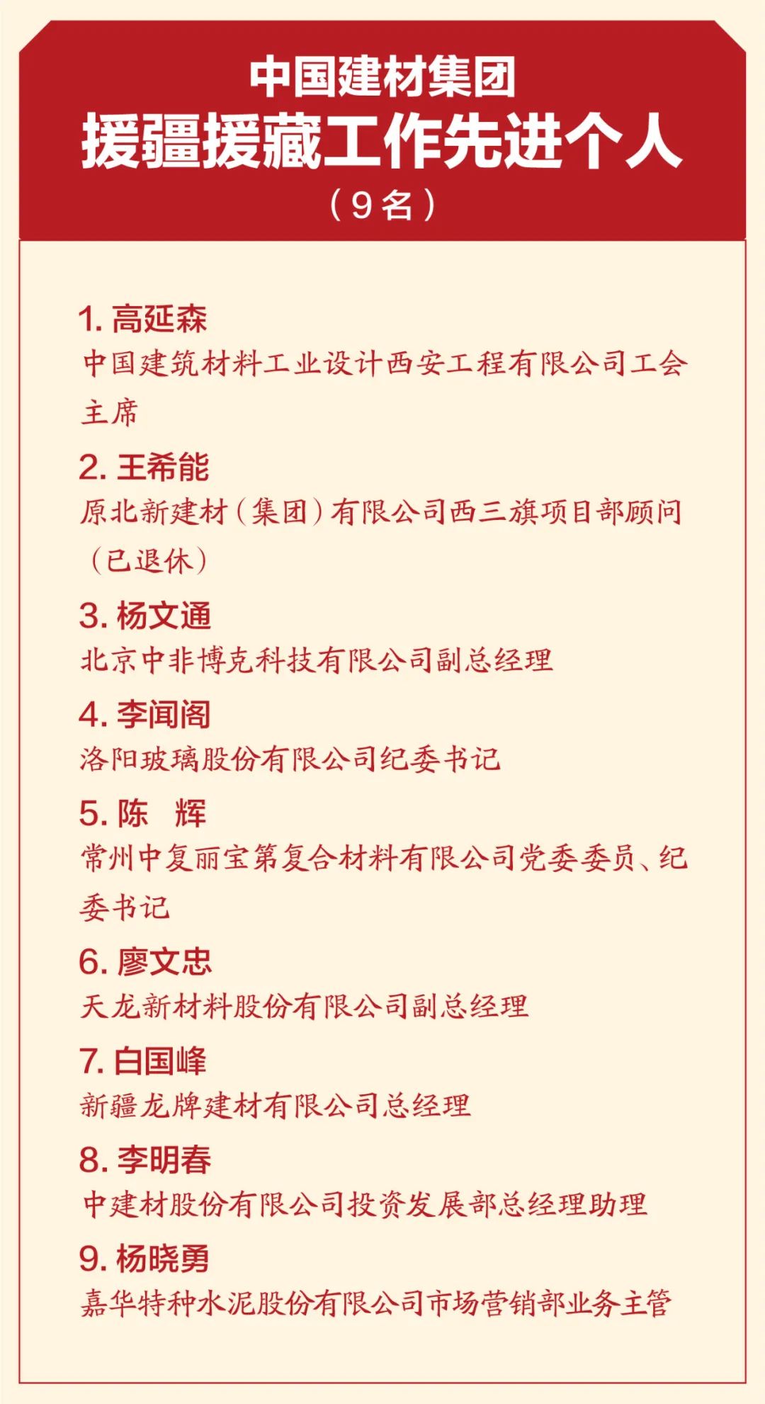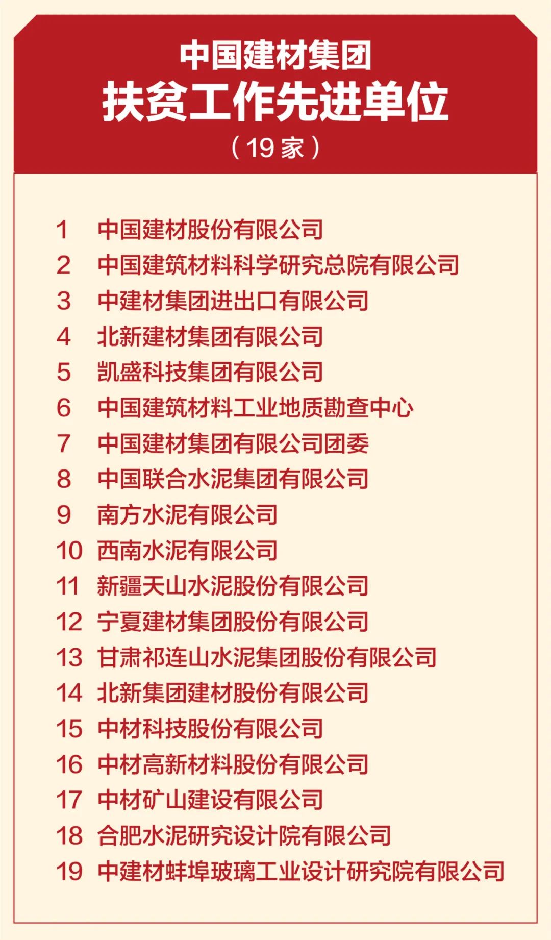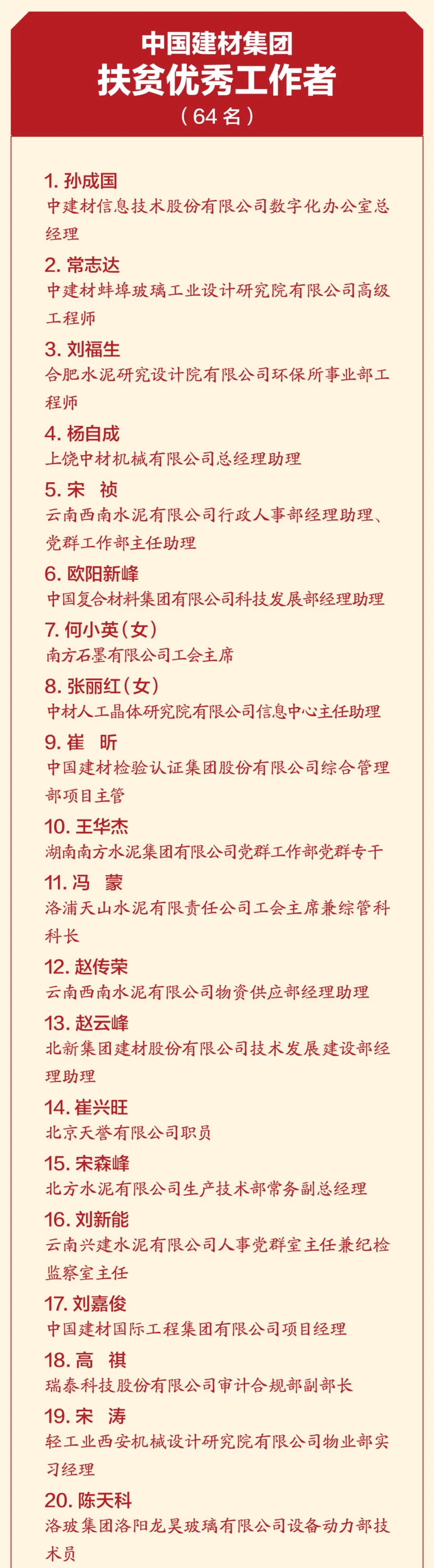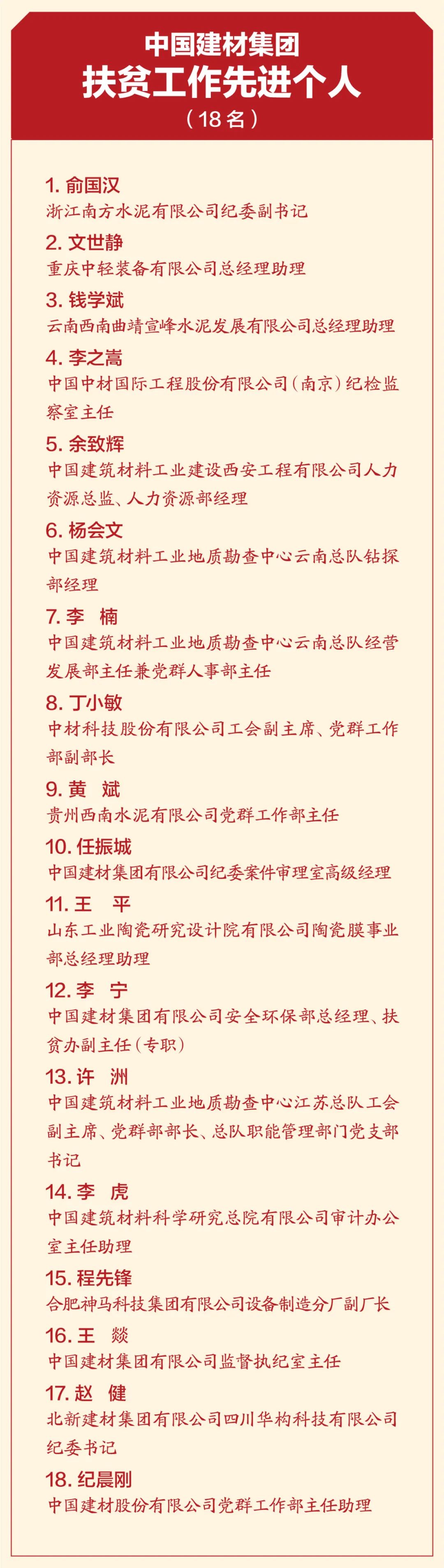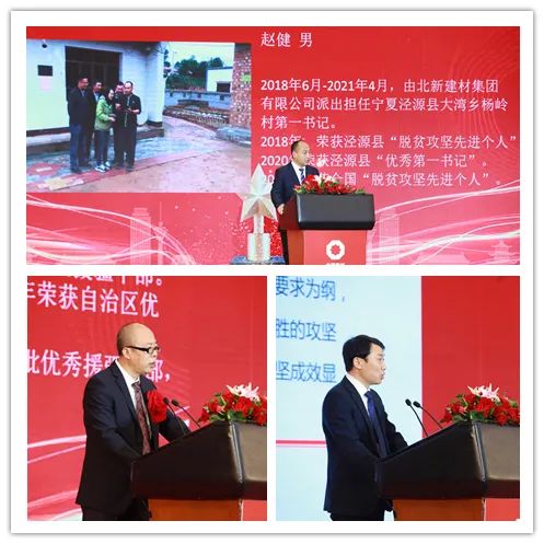 4月19日,中國建材集團扶貧工作暨援疆援藏工作表彰大會在京召開,會議深入學(xué)習(xí)貫徹習(xí)近平總書記重要講話精神,特別是習(xí)近平總書記關(guān)于扶貧工作的系列重要論述,全面總結(jié)集團扶貧工作及援疆援藏工作任務(wù)完成情況,表彰集團在扶貧工作和援疆援藏工作中涌現(xiàn)出來的先進個人和集體,并就接續(xù)鄉(xiāng)村振興做好下一階段工作做出安排部署。 中國建材集團扶貧工作紀實片 國資委科技創(chuàng)新和社會責(zé)任局副局長張曉紅出席會議并致辭,國家鄉(xiāng)村振興局社會扶貧司定點扶貧處處長周曉云,中國志愿服務(wù)基金會副理事長兼秘書長姚桂清出席會議。集團黨委書記、董事長周育先發(fā)表重要講話,集團黨委副書記、董事、總經(jīng)理曹江林宣讀表彰決定。集團黨委常委、副董事長李新華,黨委副書記孫力實,黨委常委、總會計師詹艷景,黨委常委、紀委書記楊杰,黨委常委、副總經(jīng)理王于猛、魏如山出席會議。 國資委科技創(chuàng)新和社會責(zé)任局副局長張曉紅 張曉紅在致辭中對中國建材隆重召開扶貧工作暨援疆援藏工作表彰大會表示祝賀!對中國建材在脫貧攻堅、援疆援藏工作中取得的成績表示肯定!她指出:中國建材舉全集團之力,盡銳出戰(zhàn),傾心幫扶,在扶貧工作和援疆援藏工作中體現(xiàn)出了“政治站位高、幫扶措施實、干部作風(fēng)硬、脫貧成效好”四個鮮明特點。希望中國建材繼續(xù)做好鞏固拓展脫貧攻堅成果同鄉(xiāng)村振興有效銜接,充分發(fā)揮中國建材的綜合優(yōu)勢,在落實鄉(xiāng)村振興戰(zhàn)略、助力農(nóng)村高質(zhì)量發(fā)展中作出新貢獻,取得新成績。 中國建材集團黨委書記、董事長周育先 周育先在講話中重申了扶貧工作與援疆援藏工作的重要意義。打贏脫貧攻堅戰(zhàn),是全面建成小康社會最艱巨的任務(wù),是以習(xí)近平同志為核心的黨中央向國內(nèi)外做出的莊嚴承諾。援疆援藏工作是貫徹新時代黨的治疆治藏方略的工作要求。中國建材始終堅持聽黨話、跟黨走,不忘初心、牢記使命、勇?lián)?zé)任,堅決貫徹落實黨中央、國務(wù)院和上級有關(guān)單位關(guān)于脫貧攻堅、援疆援藏工作的各項部署要求。 周育先在講話中從四個方面回顧了中國建材的扶貧工作和援疆援藏工作。一是堅持黨的領(lǐng)導(dǎo),提高政治站位,強化組織保證。二是突出精準施策,注重因地制宜,提高脫貧實效。三是創(chuàng)新幫扶模式,善用平臺資源,凝聚各方力量。四是嚴格干部選派,加強作風(fēng)建設(shè),踐行初心使命。他指出:中國建材能取得這樣的成績,根本在于黨的堅強領(lǐng)導(dǎo)、在于全方位精準施策、在于發(fā)揮好自身優(yōu)勢、在于凝聚起各方力量。在投身脫貧攻堅過程中:我們堅決落實以習(xí)近平同志為核心的黨中央決策部署,深入學(xué)習(xí)貫徹習(xí)近平新時代中國特色社會主義思想特別是習(xí)近平總書記關(guān)于扶貧工作的系列重要論述;我們認真落實以人民為中心的發(fā)展思想,堅決把精準扶貧方略落到實處,真扶貧、扶真貧;我們統(tǒng)籌推進企業(yè)發(fā)展與幫扶工作,精準實施六大幫扶措施;我們充分調(diào)動干部員工積極性和主動性,舉全集團之力,盡銳出戰(zhàn);我們與幫扶地區(qū)干部群眾同想同干,共謀發(fā)展。在扶貧工作和援疆援藏工作這場大戰(zhàn)大考中戰(zhàn)出了精氣神、考出了好成績。 脫貧摘帽不是終點,而是新生活、新奮斗的起點。2021年是十四五的開局之年,是全面實施鄉(xiāng)村振興戰(zhàn)略的起步階段。周育先要求:要以落實中央各項決策部署為根本,落實中央關(guān)于鄉(xiāng)村振興、援疆援藏的工作要求;落實集團幫扶政策,圍繞六大幫扶措施進行統(tǒng)籌安排;關(guān)心關(guān)愛幫扶干部,支持他們的工作,使幫扶干部心無旁騖的投入鄉(xiāng)村振興工作。要以黨史學(xué)習(xí)教育為契機,學(xué)史明理、學(xué)史增信、學(xué)史崇德、學(xué)史力行,不忘共產(chǎn)黨人的初心使命,大力弘揚脫貧攻堅精神,團結(jié)一心,英勇奮斗,與定點幫扶地區(qū)一起做好鞏固拓展脫貧攻堅成果與鄉(xiāng)村振興有效銜接工作,乘勢而上,再接再厲,接續(xù)奮斗,以優(yōu)異成績獻禮建黨百年! 中國建材集團黨委副書記、董事、總經(jīng)理曹江林 曹江林宣讀表彰決定,黨的十八大以來,集團積極響應(yīng)習(xí)近平總書記號召,認真貫徹落實黨中央、國務(wù)院和上級有關(guān)單位關(guān)于脫貧攻堅決策部署,集全集團之力,盡銳出戰(zhàn)、合力攻堅。2020年我國脫貧攻堅戰(zhàn)取得了全面勝利,區(qū)域性整體貧困得到解決,完成了消除絕對貧困的艱巨任務(wù)。集團定點幫扶的五個縣區(qū)已脫貧出列,援疆援藏工作也取得了階段性成果。為表彰在脫貧攻堅及援疆援藏工作中涌現(xiàn)出的先進個人和先進集體,充分展現(xiàn)脫貧攻堅成效成果,經(jīng)集團黨委研究決定:授予中國建材股份有限公司等19家成員企業(yè)“扶貧工作先進單位”稱號,授予俞國漢等18名同志“扶貧工作先進個人”稱號,授予高延森等9名同志“援疆援藏工作先進個人”稱號,授予孫成國等64名同志“扶貧優(yōu)秀工作者”稱號。 永善縣委書記戈昌武 石臺縣委書記李軍 永善縣委書記戈昌武代表定點幫扶縣區(qū)發(fā)